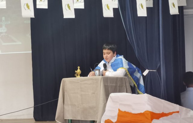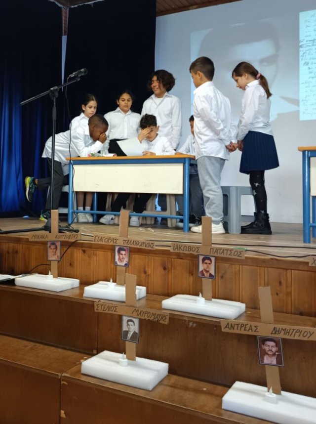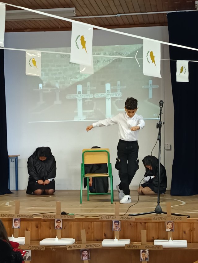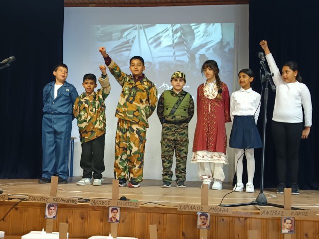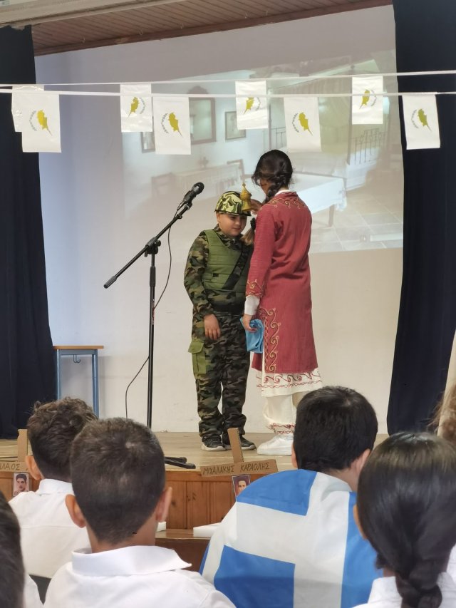 Οι μαθητές και οι μαθήτριες των Δ τάξεων του σχολείου μας ετοίμασαν μια υπέροχη γιορτή για να τιμήσουμε την εθνική επέτειο της έναρξης του απελευθερωτικού αγώνα της ΕΟΚΑ κατά των Άγγλων αποικιοκρατών.
