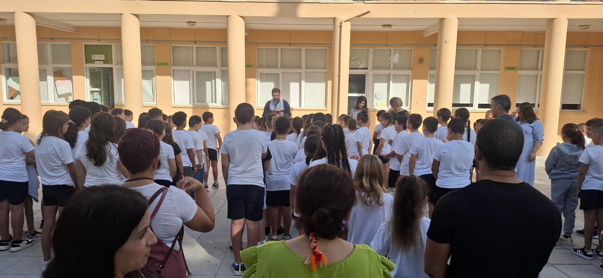 Με την ευκαιρία της έναρξης της νέας σχολικής χρονιάς 2025-2026, τη Δευτέρα 15 Σεπτεμβρίου, τελέστηκε η ακολουθία του αγιασμού στο σχολείο μας. Τον αγιασμό τέλεσε ο εφημέριος του Ιερού Ναού Αποστόλων Παύλου και Βαρνάβα Πρωτοπρεσβύτερος Κωνσταντίνος Λαζάρου. Στο τέλος του αγιασμού ο ιερέας έδωσε τις ευχές και την ευλογία του στα παιδιά και στο προσωπικό του σχολείου για καλή και παραγωγική σχολική χρονιά.