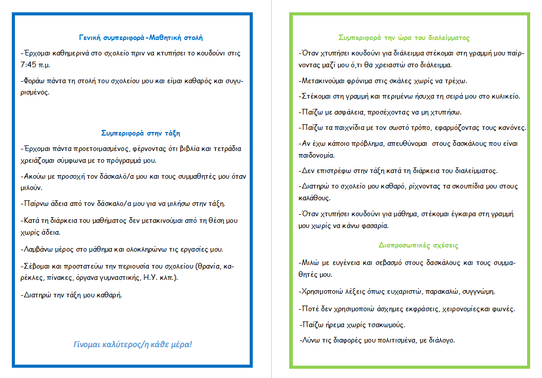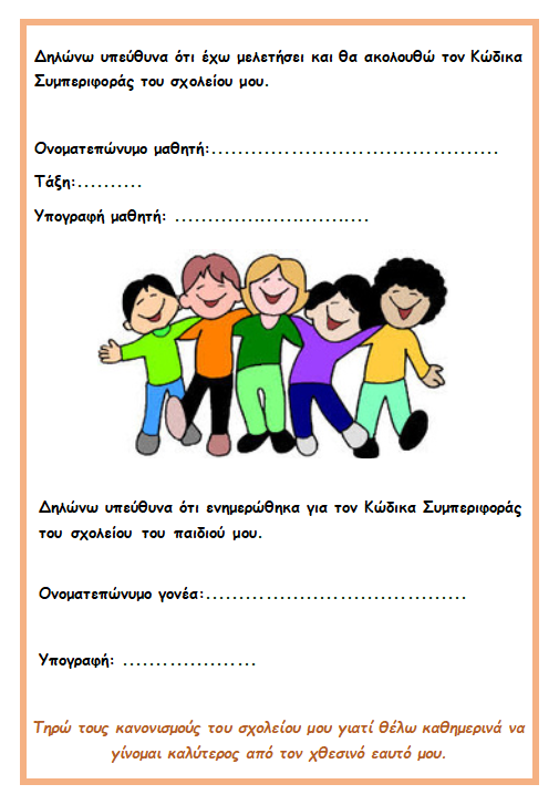 Το Κεντρικό Μαθητικό Συμβούλιο του σχολείου μας με την καθοδήγηση του εκπαιδευτικού Βάσου Κωνσταντίνου κατάρτησε Κώδικα Συμπεριφοράς.