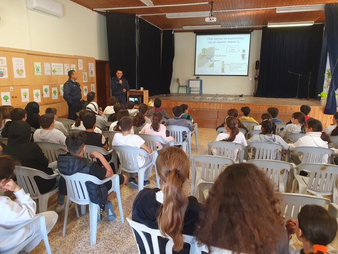 Η καλλιέργεια και εμπέδωση οδικής συνείδησης αρχίζει από μικρή ηλικία. Ταυτόχρονα, η ασφάλεια των παιδιών στις διακινήσεις τους στο οδικό δίκτυο είναι προτεραιότητα όλων και επιτυγχάνεται μέσω της εκπαίδευσής τους. Για την υλοποίηση των πιο πάνω στόχων επισκέφτηκαν το σχολείο μας αστυνομικοί από την Αστυνομική Διεύθυνση Πάφου, οι οποίοι προέβησαν σε παρουσίαση και πρακτική εκπαίδευση σχετική με την οδική ασφάλεια, την οποία παρακολούθησαν οι μαθητές και οι μαθήτριες του σχολείου μας.